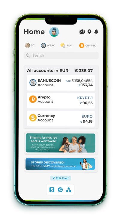 Erhalte SANUSCOINS in deiner digitalen Brieftasche. Mit den Coins kannst du dann bei all unseren Partnerunternehmen weltweit durch SANUSPAY bezahlen. Du willst die Coins gegen Fiatwährung oder andere Kryptos tauschen? Auch das ist über unsere hauseigene Wechselstube jederzeit mit einem Klick möglich.
